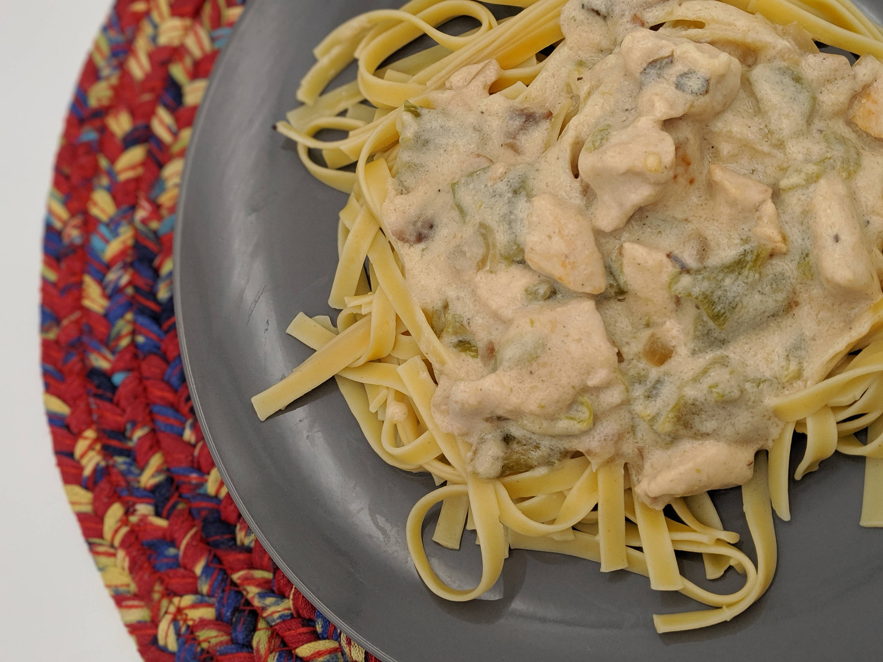 12. Add chicken, mushrooms, parmesan, and green chile. Cook for an addition 3-5 minutes.