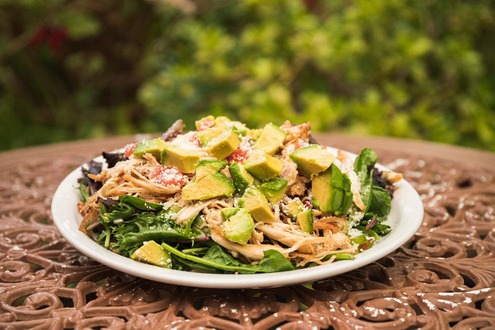 Crisp summer veggies, grilled chicken, creamy avocado, and crunch pecan encrusted Hatch Green Chile strips.