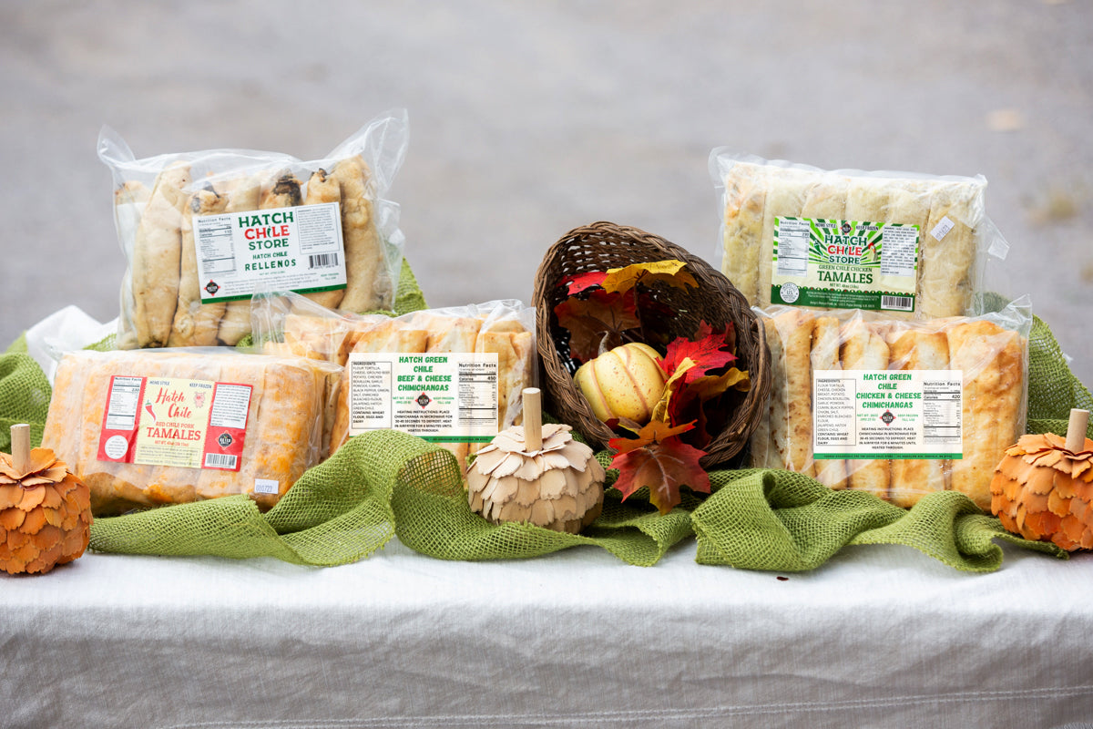 This bundle includes Chicken Chimis, Beef Chimis, Green Chile Chicken Tamales, Red Chile Pork Tamales, and Chile Rellenos.